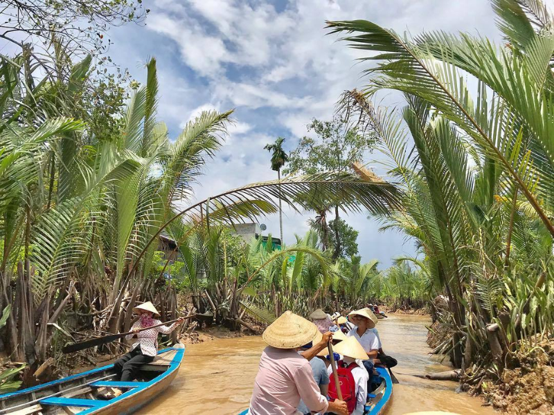 Đi xuồng chèo: Một trải nghiệm không thể bỏ lỡ! Quý khách dùng xuồng chèo len lỏi vào rạch nhỏ, ngắm nhìn hai hàng dừa nước xanh mát và tận hưởng không khí trong lành, bình dị của miệt vườn.